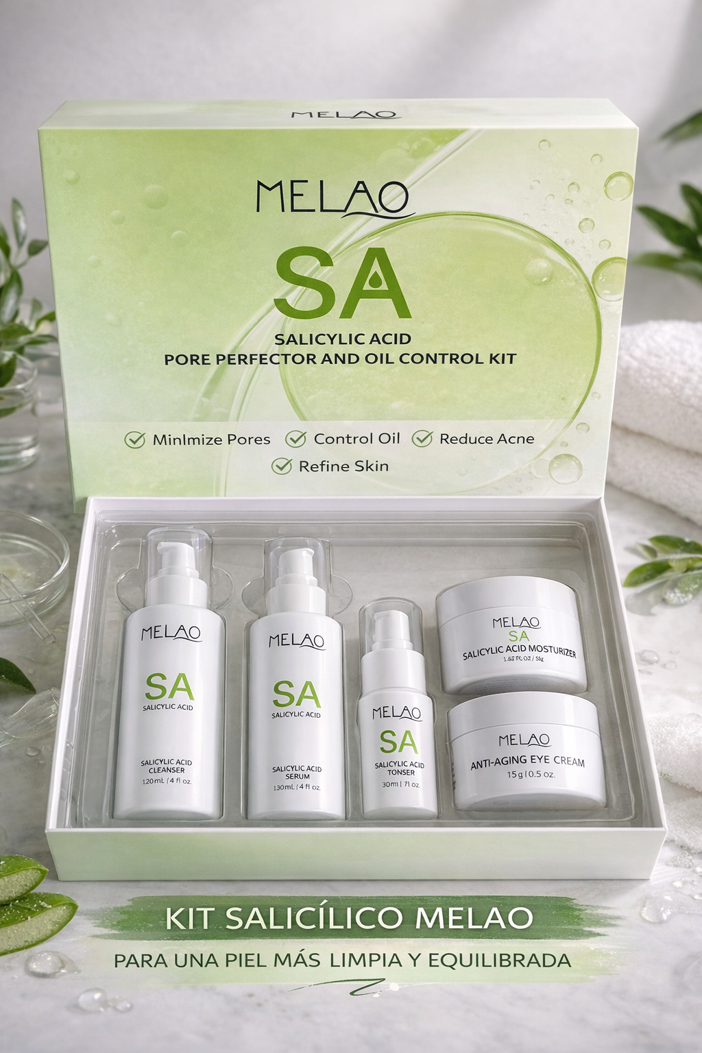 Recupera una piel más limpia, equilibrada y saludable con el Kit Anti-Acné MELAO con Ácido Salicílico, una rutina completa de cuidado facial diseñada para ayudar a controlar el exceso de grasa, minimizar la apariencia de los poros y mejorar la textura de la piel.