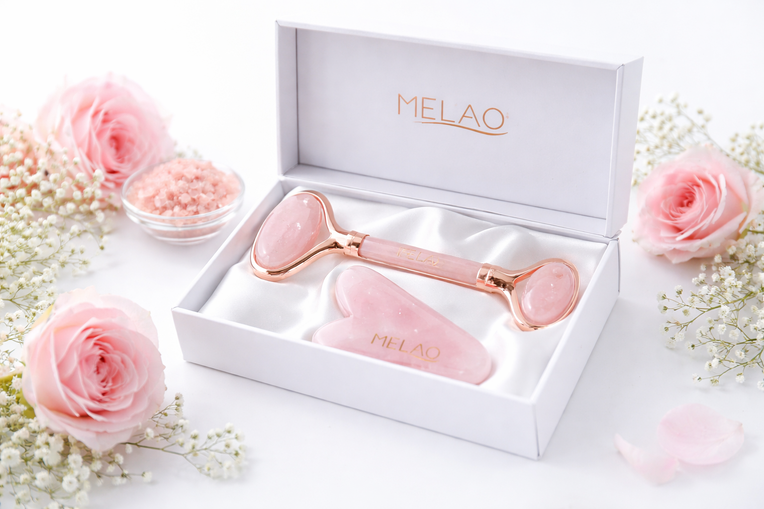 – Añade hoy tu Kit Roller y Gua Sha de Cuarzo Rosa MELAO y disfruta una piel más firme, fresca y luminosa.
